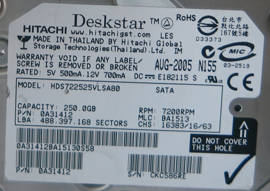 HDS722525VLSA80, MLC BA1513, F 13G0208 01