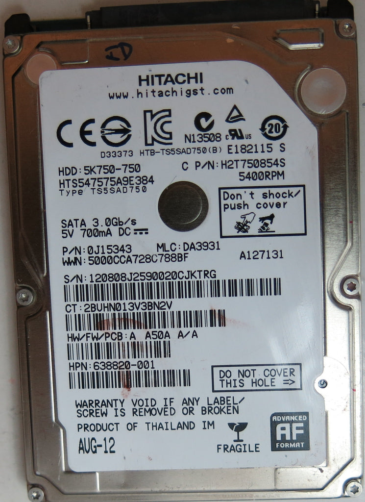 HITACHI HTS547575A9E384 PN 0J15343 MLC DA3931, 160GB